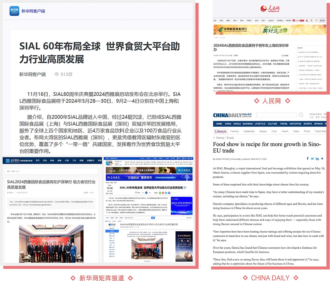 SIAL西雅展憑借著自身的國際化基因以及對(duì)于食飲貿(mào)易的促進(jìn)效果,持續(xù)受到600+各方媒體的關(guān)注和報(bào)道,包括新華社、人民日?qǐng)?bào)、中國新聞社、CHINA DAILY等權(quán)威媒體和浙江衛(wèi)視、深圳衛(wèi)視、山東電視臺(tái)、浦東電視臺(tái)、上海廣播電視臺(tái)外語頻道等多家電視媒體。這些媒體在展會(huì)現(xiàn)場為品牌展商提供多元且權(quán)威的報(bào)道,助力展商品牌曝光、產(chǎn)品流通。