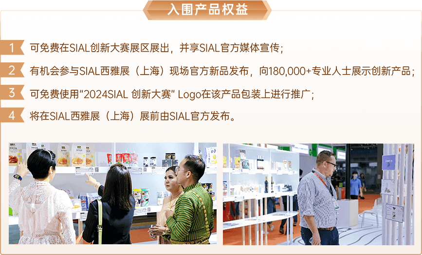 | “SIAL Innovation創(chuàng)新大賽” 參賽報(bào)名線上通道開放僅剩最后10天!2024 SIAL西雅展(上海)的所有展商均可參加!報(bào)名參與賽事,就有機(jī)會(huì)獲得向全球宣傳推廣創(chuàng)新產(chǎn)品的機(jī)會(huì)。報(bào)名截止日期:2024年4月22日 |