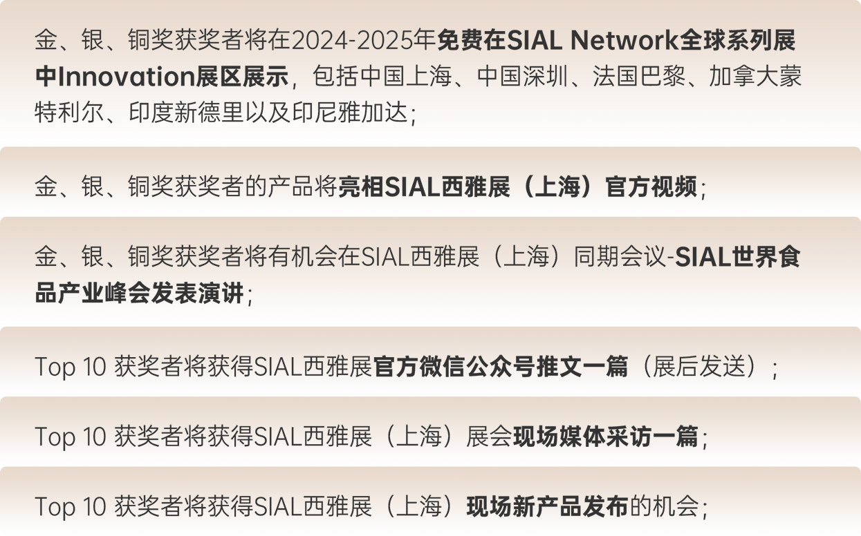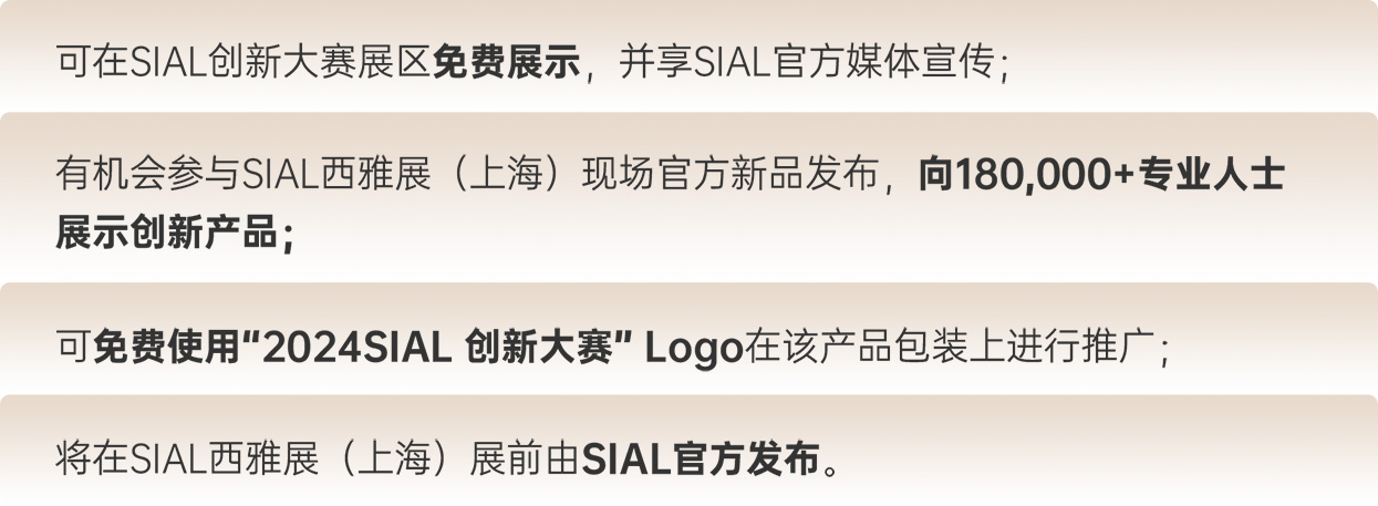 | “2024 SIAL Innovation創(chuàng)新大賽”參賽報名線上通道開放時間延期至4月30日,還未報名參賽的2024 SIAL 西雅國際食品和飲料展覽會(上海)展商,快來報名,抓住向全球展示創(chuàng)新產(chǎn)品的機(jī)會!即刻點擊下方“快速報名參賽”按鈕,進(jìn)入“展商會員中心”后,點擊“上海創(chuàng)新大賽”添加參賽產(chǎn)品信息。 |