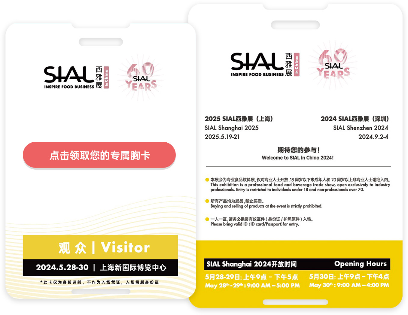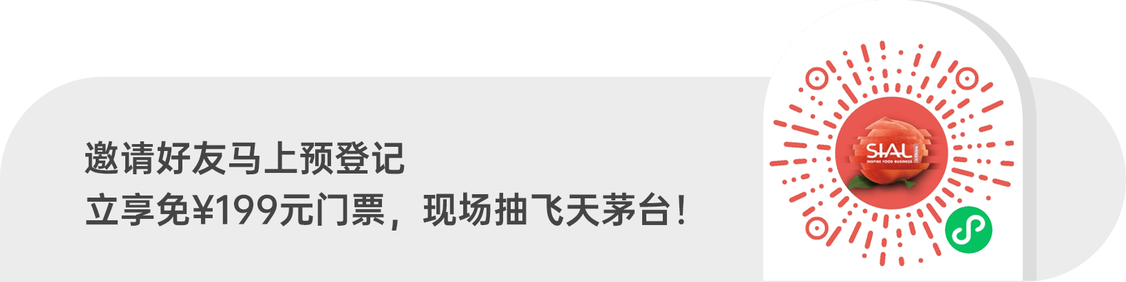 | 1. 提前申請(qǐng)預(yù)登記門(mén)票,可節(jié)省展會(huì)現(xiàn)場(chǎng)199元門(mén)票費(fèi)用; 2.通過(guò)官網(wǎng)“SIAL商機(jī)在線”和微信“SIAL在線”小程序平臺(tái),提前預(yù)約心儀展商,精準(zhǔn)貿(mào)易對(duì)接,參展效率加倍; 3.提前獲得與全球75個(gè)國(guó)家和地區(qū)的5,000+展商洽談貿(mào)易的機(jī)會(huì),展會(huì)現(xiàn)場(chǎng)更有全球350,000+好品等您選。 | |||