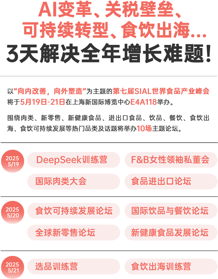 *請(qǐng)注意,本屆峰會(huì)門票不包含SIAL西雅展(上海)參觀門票,請(qǐng)您盡快完成展會(huì)實(shí)名注冊(cè) |