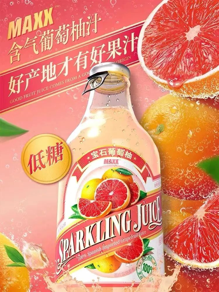 元氣森林的果汁新品屬于旗下子品牌“MAXX”,目前僅有葡萄柚一個口味。在產(chǎn)品賣點上,MAXX含氣葡萄柚汁采用西班牙穆爾西亞進口西柚汁,同時強調(diào)“低糖”屬性。
