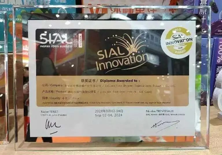 恭喜黑龍江中穆沙棘產(chǎn)業(yè)有限公司《沙棘籽油凝膠糖果》獲得本次西雅展會創(chuàng)新大賽唯一金獎??!