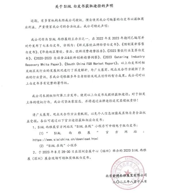 2、于2023年8月28-30日在深圳會展中心(福田)舉辦的2023 SIAL西雅展(深圳)展會現(xiàn)場可領(lǐng)取實(shí)體版白皮書。