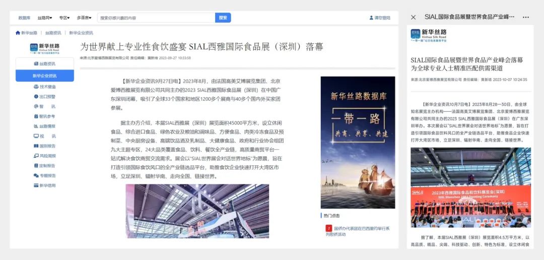 9-10月,“一帶一路”綜合信息服務平臺“新華絲路”資訊板塊接連發(fā)布《SIAL國際食品展暨世界食品產(chǎn)業(yè)峰會落幕 為全球?qū)I(yè)人士精準匹配供需渠道》、《為世界獻上專業(yè)性食飲盛宴 SIAL西雅國際食品展(深圳)落幕》兩篇文章對于2023 SIAL西雅展(深圳)進行報道。